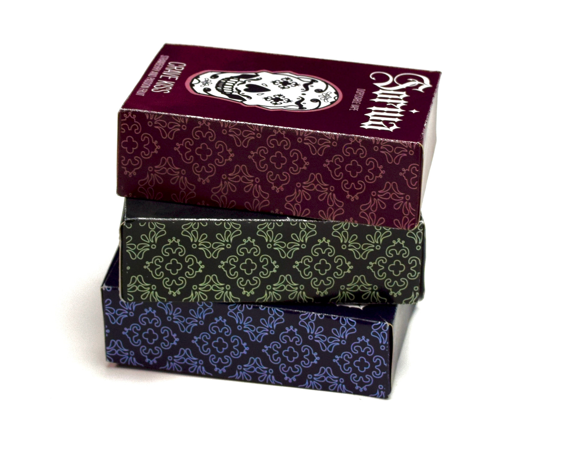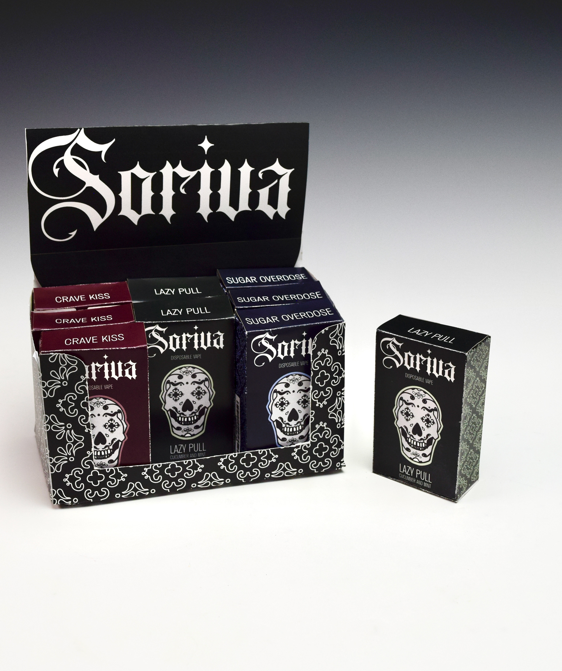 The brand identity was built around a style rooted in cultural influence and visual storytelling. I incorporated elements from my Hispanic heritage, using a traditional lace pattern and a sugar skull as the main logo to convey personality, boldness, and cultural richness. This design direction set the tone for the product packaging, especially in the vape box line, establishing a strong, recognizable brand presence. Along with that, I also designed a pop-up display box that seamlessly aligned with the brand identity and extended the visual system beyond the product itself.