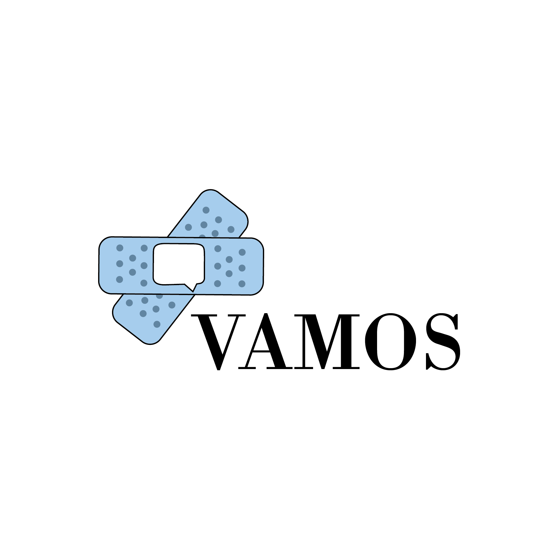 The VAMOS logo merges two symbolic elements: Bandages representing healthcare, healing, and physical care, and a Speech Bubble representing communication and language access
